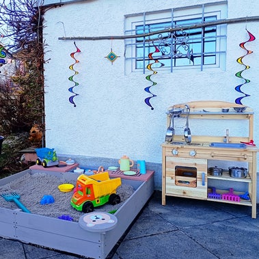 Unsere Tochter hat bisher viele tolle Sachen gebastelt und im Kindgerechten, Kreative gestaltete Garten gibt es viel zu entdecken.
